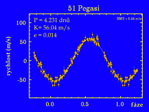Touto metodou byla na konci roku 1995 odhalena první extrasolární planeta – u hvězdy 51 Peg. Objev extrasolární planety u hvězdy 51 Pegasi s hmotností podobnou Jupiteru, ale s extrémně malou vzdáleností 0,05 au od hvězdy vyvolal řadu pochybností o správnosti interpretace naměřených dat a vyvolal dohady, zdali nelze periodické změny radiální rychlosti objasnit neradiálními pulsacemi samotné hvězdy. Z pozorované neměnnosti tvaru spektrálních čar hvězdy 51 Peg v závislosti na oběžné době exoplanety však plyne, že možnost neradiálních pulsací hvězdy je nepatrná mimo jiné i proto, že hvězda má stálou jasnost s přesností ±0.0007 magnitudy. Další přesná měření z let 1995 až 1996 potvrdila všechny parametry exoplanety tak, jak je odvodili ve své průkopnické práci Michel Mayor a Didier Queloz. Vzdálenost hvězdy byla určena na 15.4 pc. Hvězda o hmotnosti 1.12 MS je stará asi 4 miliardy let a do vzdálenosti 2 au od ní neobíhá žádná další exoplaneta s hmotností Jupiteru či větší.