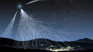 v kosmickém zářeníKosmické záření – proud částic nejrůznějšího původu přilétající z vesmíru. Při interakci s atmosférou vzniká sprška milionů i miliard částic. Nejenergetičtější částice kosmického záření, které se dosud podařilo detekovat, mají energie až 1020 eV. Sprška z takové částice zasáhne na zemském povrchu mnoho desítek km2. Tak energetická částice se objeví přibližně jednou za sto let. Kosmické záření je majoritním zdrojem antihmoty na naší planetě. Může vznikat v supernovách, pulzarech, aktivních galaktických jádrech, atd. Naprostá většina částic kosmického záření, okolo 88 %, jsou protony, přibližně 10 % jsou jádra hélia (alfa záření), 1 % elektrony a pozitrony a 1 % těžké prvky. Kosmické záření má naprosto nejširší spektrum energií ze všech dodnes známých jevů. Mnohé částice, které se dnes vědci pokoušejí nalézt v moderních urychlovačích, se mohou nacházet právě v kosmickém záření. Kosmické záření bylo objeveno v roce 1912 rakouským fyzikem Victorem Hessem při balónových experimentech ve výšce až 5 300 metrů. S rostoucí výškou stoupala ionizace atmosféry, a tím byl prokázán kosmický původ záření. Za objev získal Hess v roce 1936 Nobelovu cenu za fyziku..