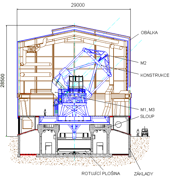 Nalevo: Schéma dalekohledu v řezu. Napravo: Jeden z dalekohledů (Kueyen)