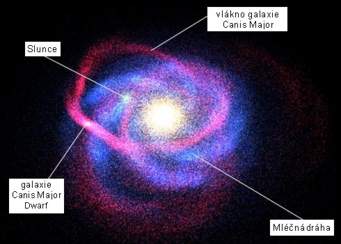 Schematický nákresek galaxií do 500 000 ly. Jde o 10 trpasličích galaxií. Na obrázku není nově objevená galaxie Canis Major Dwarf, která by se jevila jen jako zhuštění vlákna v Galaxii v pozici 240°. Přesnou polohu naleznete na animaci vytvořené na Universitě Louise Pasteura (1,2 MB) ve Francii.