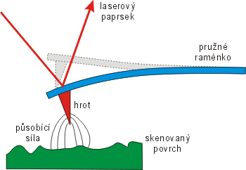 Schéma mikroskopu AFMMikroskop atomárních sil – AFM (Atomic Force Microscope). Zařízení skenuje povrch materiálu pomocí hrotu zavěšeného na pružném výkyvném raménku. Hrot je přitahován elektrostatickými a van der Waalsovými silami. Výkyvy raménka nad povrchem jsou sledovány laserem. AFM mikroskop není omezen na vodivé materiály jako STM mikroskop. AFM mikroskop byl vynalezen v roce 1986 G. Binnigem, C. Quatem a C. Gerberem..