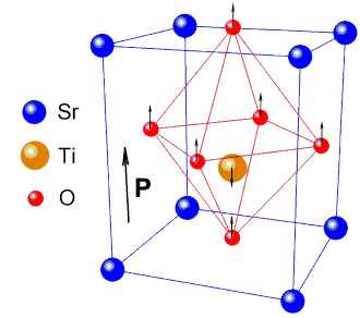 Kryštál feroelektrikaFeroelektrikum – látka schopná udržet si dipólový moment (vlastní elektrické pole ve svém okolí) i bez vnějšího elektrického pole. Příkladem feroelektrik jsou látky s chemickým vzorcem ABO3, kde A a B jsou dva různé kovy, například SrTiO3. SrTiO3. Atóm Ti sa vzhľadom k okolitým atómom kyslíka nenachádza v strede, ale je vychýlený do jedného zo šiestich možných smerov, čím vzniká lokálne elektrické pole a teda polarizácia. Zdroj: Colossal Storage Corp.