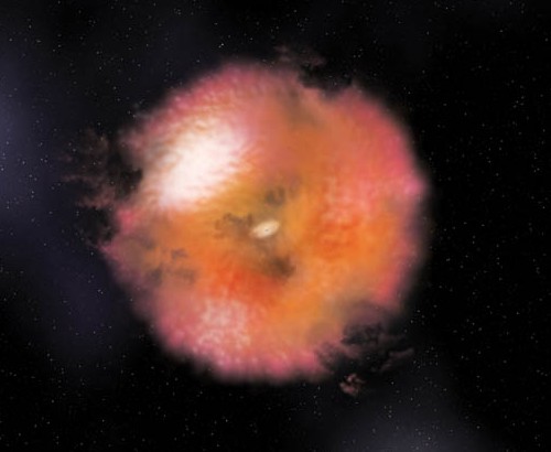 Gama záblesk – osamělá hvězda. Gama záblesky jsou jednou ze současných velkých záhad astrofyziky vysokých energií. Přicházejí k nám rovnoměrně ze všech stran přibližně jednou denně. Jejich trvání je od několika milisekund až po několik minut. Dnes víme, že mechanizmů generování těchto záblesků bude několik. Jedním z nich by mohl být kolaps osamocené velmi hmotné hvězdy na černou díru (supernova Ic), který můžete sledovat na této počítačové animaci. Nejprve vznikají výtrysky plazmatu ve směru rotační osy, později kolabuje Fe jádro a vytváří se tlustý akreční disk a v centru rotující černá díra. Zdroj: NASA / SkyWorks Digital, 2005. (avi, 2 MB)
