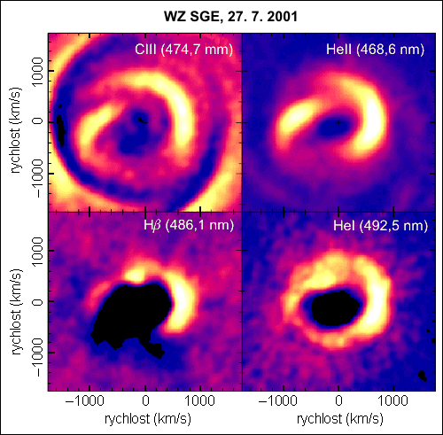 Spektrografem na 2,5-metrovém dalekohledu INTINT – Isaac Newton Telescope. Jeden ze tří dalekohledů skupiny ING. Dalekohled Isaac Newton Telescope má primární zrcadlo o průměru 2,54 m a ohniskový poměr f/2,94. Pracuje na rovníkové montáži. Přístroje mohou být umístěny do korigovaného primárního ohniska f/3,29 nebo do f/15 ohniska Cassegrainova. Celková hmotnost je okolo 90 tun. Dalekohled je určen k širokoúhlému snímkování a k nízkodisperzní spektroskopii. na observatoři La Palma byly pořízeny tyto snímky spirálních struktur v akrečním disku WZ Sge. Dopplegramy ukazují rozložení emise He II (468,6 nm) a CIII (474,7 nm) a lze z nich vyčíst, že v disku dominují dvě spirální ramena. H-beta a He I (492,5 nm) naopak vykazují vysoce proměnnou absorpci jádra struktury. Je to poprvé, co byla pozorována spirální struktura akrečního disku u WZ Sge. Od následných pozorování této soustavy je očekáváno porozumění vývoji struktury akrečních disků. Zdroj: AAVSO, Harvard Smithsonian Center for Astrophysics.