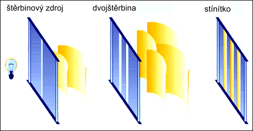 Youngův dvojštěrbinový experiment je nejjednodušší variantou zařízení, ve kterém probíhá interference dvou svazků. Thomas Young demonstroval tímto experimentem v roce 1801 vlnovou povahu světla. Štěrbina (nalevo) vytváří válcové vlnoplochy, které prochází dvěma velmi blízkými štěrbinami (uprostřed). Na stínítku (napravo) lze pozorovat charakteristický interferenční obrazec. V roce 1909 použil obdobné zařízení Geoffrey Ingram Taylor k důkazu, že interference nastane i tehdy, je-li světelný zdroj natolik slabý, že se v prostoru zařízení nachází maximálně jeden jediný foton.