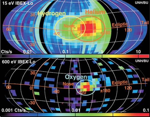 V říjnu tohoto roku byly publikovány první souborné výsledky mise. Dosud byla z oblasti terminační vlnyTerminační vlna – jiným názvem rázová vlna slunečního větru je oblast, ve které rychlost částic slunečního větru klesá na podzvukovou rychlost. Tato oblast má tvar povrchu koule a je vzdálena přibližně 90 až 95 au od Slunce. známa jen velmi útržkovitá měření. Sondy VoyagerVoyager – dvojice sond NASA, která startovala v roce 1977 pomocí nosných raket Titan/Centaur. V roce 1979 proletěly obě sondy kolem Jupiteru, v roce 1980 (Voyager 1) a 1981 (Voyager 2) kolem Saturnu. Voyager 2 pokračoval dále k Uranu (1986) a Neptunu (1989). Obě sondy se zásadním způsobem zasloužily o poznání Sluneční soustavy a dnes jsou nejvzdálenějšími objekty, které lidstvo vyslalo do vesmíru. sice terminační vlnou prolétly, jejich měření jsou velmi přesná, ale tyto sondy dokázaly změřit jen charakteristiku prostředí, kterým přímo prolétaly. Šlo spíše o něco jako „odebírání vzorků“ než o mapování rozsáhlé oblasti. Sonda UlyssesUlysses – Odyseus, sonda určená pro sledování heliosféry Slunce z vysokých slunečních šířek. Hlavním cílem byl výzkum Slunce a jeho vlivu na meziplanetární prostor. Sonda měla dráhu navrženou tak, že jižní pól Slunce prozkoumala v roce 1994, ke Slunci se opět vrátila v roce 1995, kdy se přiblížila k severnímu pólu. Do stejných oblastí se vrátila v letech 2000 a 2001 při svém druhém oběhu. V té době bylo Slunce v blízkosti maxima aktivity. Při posledním třetím návratu v roce 2007 a 2008 byla mise ukončena, sonda ztratila orientaci. objevila horké protonyProton – částice složená ze tří kvarků (duu) se spinem 1/2, hmotností 1,673×10−27 kg (938 MeV) a elektrickým nábojem +1,6×10−19 C. Proton je na běžných časových škálách stabilní, pokud se rozpadá, je poločas rozpadu větší než 1035 let. Za objevitele protonu je považován Ernest Rutherford, který v roce 1911 objevil atomové jádro při analýze rozptylu částice alfa pronikající tenkou zlatou fólií. Samotná jádra vodíku (protony) detekoval v roce 1918 při ostřelování dusíku částicemi alfa. Antiproton byl objeven v roce 1955 Emilio Segrem a Owenem Chamberlainem. a ionty přicházející z čela rázové vlny heliosféryHeliosféra – oblast magnetického vlivu Slunce. Heliosféra není kulová, jak by se mohlo zdát z jejího názvu. Je od Slunce v různých směrech různě vzdálená, zhruba 110 až 160 au. Uvnitř heliosféry se nachází plazma slunečního větru. Heliosféra končí hraniční vrstvou, jejíž vnější část se nazývá heliopauza. již v roce 1999, nebyla však vybavena přístroji, které by umožnily jejich podrobnější a přesnější studium. Výsledky mise IBEX jsou oproti dosavadním poznatkům velmi překvapivé. Rozložení horkých atomů přicházejících z terminační vlny bylo sice očekáváno v proměnlivých koncentracích, ale někde kolem desítek procent a ve velkých prostorových úhlech. Měření prokázala velké množství malých oblastí, v nichž se mění množství záznamů až v několika stovkách procent. Navíc oblasti, z nichž vysoce energetické částice a atomy přicházejí, nejsou vůbec rozloženy na obloze rovnoměrně, jak by se zdálo z předchozích modelů zahrnujících jen velikost a pohyb heliosféry mezihvězdnou látkou. Horké oblasti vytvářejí na hranici heliosféry výrazné skvrny, které je možno propojit do pásu táhnoucího se oblohou. V čele rázové vlny jsou atomy různých prvků (vodík, helium, kyslík apod.) rozloženy nerovnoměrně a jsou-li zobrazeny mapy jejich koncentrací, nekryjí se jednotlivé obrazce. Znamená to, že oblaka mezihvězdné látky nejsou až tak homogenní, jak bychom na škále rozměrů heliosféry očekávali. Možná zde navíc působí ještě jiné dosud nepopsané mechanizmy, které tuto nehomogenitu podporují. Jako výchozí vysvětlení se prozatím jeví ovlivnění hranice heliosféry mezihvězdným magnetickým polem, které v sobě má struktury o velikosti srovnatelné s rozměry heliosféry.