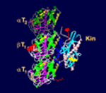 Konformační změna hlavičky kinezinu díky hydrolýze ATP na ADP vizualizovaná pomocí programu VMD. Fosforečnanový anion, který se při hydrolýze odštěpuje, je vyznačen na kuličkovém modelu ATP zelenou barvou. Zbylý ADP je znázorněn červeně. Fialově je znázorněn hořečnatý kation, který se rovněž podílí na změně uspořádání bílkoviny. Modrý hadicový model kinezinu je doplněn žlutými předpokládanými vazebnými místy na tubulinech. Zdroj: TCB University of Illinois at Urbana Champaign.