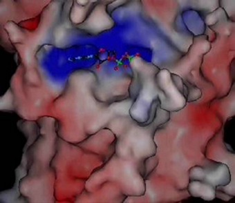 Odlišnosti ve struktuře kinezinů. V tomto případě je znázorněna molekula ADP ve vazebném místě kinezinu Kar3 kvasinky Saccharomyces cerevisiaeSaccharomyces cerevisiae – pivovarská kvasinka, modelový organismus. První eukaryotní organismus, u kterého byla určena sekvence nukleotidů v DNA.. Kladně nabité oblasti jsou znázorněny červeně, záporně modře. Vazebné místo pro růžově znázorněný hořečnatý kation se u tohoto kinezinu odhalí až po naklonění na animaci vpravo. Zdroj: MPASMB-Hamburg