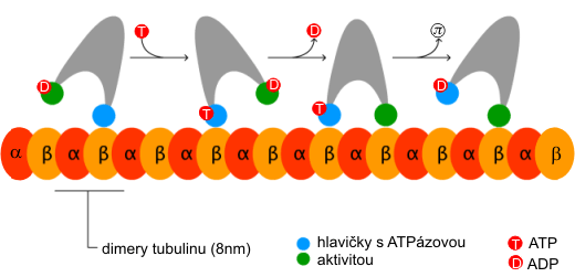 Schéma kráčivého pohybu hlaviček kinezinu po