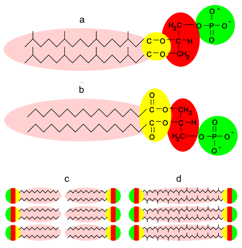 Buněčné membrány archeí (a, d), baktérií a eukaryot (b, c). Stavbou membrán se archea liší jak od eukaryot, tak od baktérií. To naznačuje, že všechny tři nadříše se vyvíjely svou vlastní cestou. Zdroj: Wikipedia.