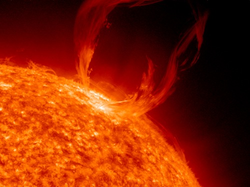 Jeden z prvních snímků Slunce pořízený 30. března 2010 při zahájení činnosti observatoře SDO (oproti originálu je otočen o 90°). Vlnová délka filtru byla 30,4 nm, což odpovídá čáře jedenkrát ionizovaného helia (teplotě 50 000 °C). Na snímku je dobře patrná protuberance. Po kliknutí získáte snímek ve vyšším rozlišení. Prohlédněte si také video složené z po sobě pořízených snímků. Zdroj NASA/SDO.