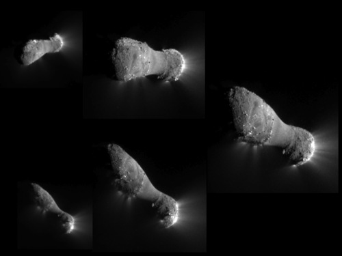 Kometa zblízka. Pět snímků, které se podařilo pořídit při rychlém průletu sondy kolem komety, ukazuje nápadně různý povrch jádra i ve velkém měřítku. Neočekávaná je hladká střední část tělesa, která není nikterak členitá krátery či jinými nerovnostmi typickými naopak pro oba konce protaženého tělesa. Výtrysky, které jsou původci zářící hlavy komety, jsou evidentní výhradně z koncových hlavic protáhlého jádra a na hladké střední části se nenacházejí. Snímky byly pořízeny postupně od horního pravého přes levý uprostřed k dolnímu pravému ve směru hodinových ručiček. Zdroj: Projekt EPOXI.