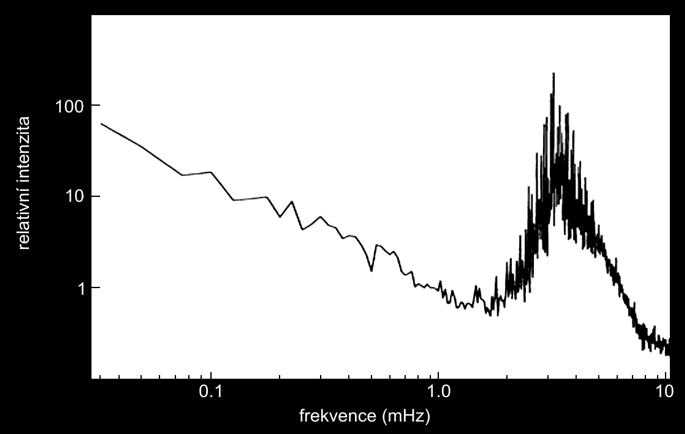 Obr. 1. Zastoupení frekvencí oscilací p vln měřené observatoří SOHO mezi 19. únorem a 25. březnem 1996. Pětiminutovým oscilacím odpovídá výrazné maximum na 3,3 mHz. Zdroj NASA/ESA.