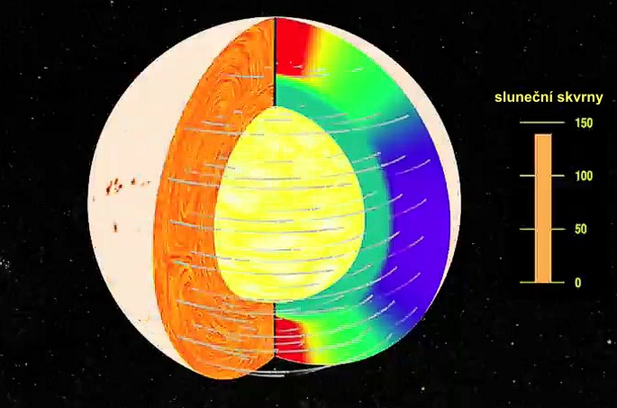 Obr. 6. Podpovrchové proudění na Slunci. Toky jsou kombinací toroidálních (ve směru rotace Slunce, pravá část řezu) a meridiálních (od rovníku k pólu, levá část řezu). Barva odpovídá rotační periodě. Fialová barva v blízkosti rovníku odpovídá periodě rotace 24,5 dne. Směrem k pólům je perioda rotace pomalejší. Červená u pólu odpovídá rotační periodě 34 dni. Závislosti rotační periody na heliografické šířce říkáme diferenciální rotace. Olivově zeleně je znázorněna tachoklina (rozhraní mezi zářivou a konvektivní vrstvou). Zářivá vrstva s periodou rotace 28 dní je znázorněna žlutě. Zářivá vrstva rotuje jako pevné těleso, nejeví známky diferenciální rotace. V levé části řezu jsou znázorněny meridiální toky plazmatu mezi rovníkem a póly, které jsou součástí tzv. torzních oscilací Slunce. Klepnutím na obrázek spustíte animaci (avi/xvid, 16 MB) získanou na základě helioseismologických měření. Zdroj NASA/GSFC.