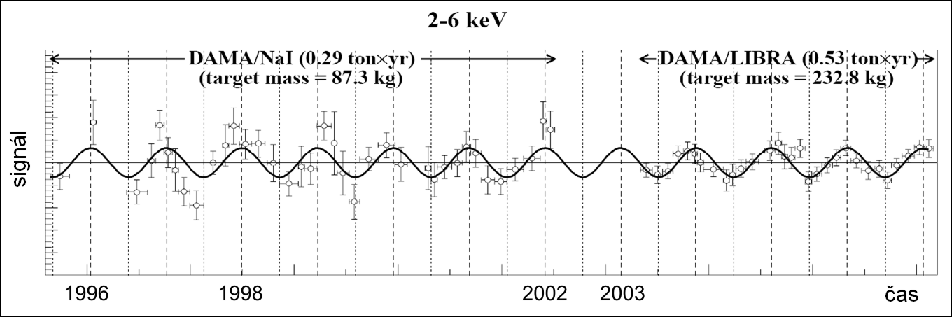 Do loňského roku byl jediným úspěšným zařízením při hledání částic temné hmoty detektor DAMA v italské národní laboratoři pod horou Gran Sasso, který poskytoval jakýsi signál již od roku 1996. kdy byl uveden do provozu. Jde o scinitilační detektor, jehož základem jsou krystaly NaI, které by při slabé interakci atomových jader aktivní látky s wimpyWIMP – zkratka z Weakly Interacting Massive Particle, vážný kandidát na částice temné hmoty. Mělo by jít o reliktní superpartnery z období po Velkém třesku, kterým fyzikální zákony zabránily v následném rozpadu. Wimpy by měly s běžnou látkou interagovat gravitační a slabou interakcí. Jsou usilovně hledány v několika desítkách experimentů, tři z nich mají nenulový signál, jehož interpretace je zatím nejasná. měly dát záblesk zachytitelný fotonásobičemFotonásobič – často označováno jako PMT (PhotoMultiplier Tube), vakuová fotocitlivá součástka využívající zesilovacího efektu prostřednictvím sekundární emise na systému elektrod. Prvotní proud, iniciovaný dopadem světla na světlocitlivou vrstvu, fotokatodu, je tak mnohonásobně zesílen. Napětí mezi elektrodami je několik set voltů a je nastaveno tak, aby koeficient sekundární emise při dopadu elektronu na její povrch byl kladný. Fotonásobiče pracují v impulzním režimu.. Okolí detektoru vypadá jako hranatá cibule. Prvním obalem je měďMěď – Cuprum, ušlechtilý kovový prvek načervenalé barvy, používaný člověkem již od starověku. Vyznačuje se velmi dobrou tepelnou a elektrickou vodivostí, dobře se mechanicky zpracovává a je odolný proti atmosférické korozi. Je základní součástí řady velmi důležitých slitin a mimořádně důležitý pro elektrotechniku., pak následuje olovoOlovo – Plumbum, těžký toxický kov, který je znám lidstvu již od starověku. Má velmi nízký bod tání a je dobře kujný a odolný vůči korozi. Je součástí barviva – olovnaté běloby, žlutý chroman olovnatý je známý jako chromová žluť. Zvyšuje oktanové číslo paliva. Velmi čistý PbS je citlivým detektorem infračerveného záření a využívá se při výrobě fotografických expozimetrů a fotočlánků., další vrstva je z polyetylénu a vosku, následuje atmosféra z velni čistého dusíkuDusík – Nitrogenium, plynný chemický prvek tvořící hlavní složku zemské atmosféry. Patří mezi biogenní prvky, které jsou základními stavebními kameny živé hmoty. Tento plyn popsal jako první Němec Carl Wilhelm Scheele v roce 1777. Poté co bylo zjištěno, že je kyselina dusičná odvozena od dusíku, pro něj Chaptal navrhl název nitrogéne, což znamená ledkotvorný, který se udržel v latinském označení nitrogenium., která zamezuje kontaminaci radonemRadon – Radonum, nejtěžší prvek ve skupině vzácných plynů, je radioaktivní a nemá žádný stabilní izotop. Byl objeven roku 1900 Friedrichem Ernstem Dornem. V geologii slouží studium obsahu izotopů radonu v podzemních vodách k určení jejich původu a stáří. Radon se využívá i v medicíně jako zářič s krátkým poločasem rozpadu., poslední vrstvu tvoří metr tlustý betonový kontejner. V první fázi (1996 až 2002) byl detektor provozován s 87 kilogramy scintilační látky. Od roku 1998 byla v signálu rozpoznána relativně slabá roční variace. Ta by mohla být způsobena tím, jak ZeměZemě – největší z planet zemského typu. Je jedinou planetou v celém vesmíru, o které víme, že na ní existuje život. Má dostatečně hustou atmosféru, dostatek kapalné vody v povrchových oceánech. Kolem Země obíhá jediný měsíc s vázanou rotací. Při pozorování Země z kosmu vidíme hlavně modrou barvu oceánů. 70 % povrchu Země je pokryto oceány, 30 % tvoří kontinenty. Země sestává z těchto vrstev: jádro, plášť, kůra, troposféra, stratosféra, mezosféra, termosféra. Plášť a kůra jsou odděleny tzv. Mohorovičiæovým rozhraním. Kůra se posouvá a „plave“ na polotekutém plášti. Teplota v centru Země je 5 100 °C, tlak 360 GPa. Magnetické pole Země má přibližně dipólový charakter, je deformováno slunečním větrem do typického tvaru. při svém oběhu kolem SlunceSlunce – nám nejbližší hvězda, tzv. hvězda hlavní posloupnosti, která se nachází ve vzdálenosti 149,6×106 km od Země. Jde o žhavou plazmatickou kouli s průměrem 1,392×106 km, teplotou na povrchu 5 780 K, teplotou v centru přibližně 15×106 K a zářivým výkonem 3,846×1026 W. Zdrojem energie je jaderná syntéza, při které se za každou sekundu sloučí v jádru Slunce 700 milionů tun vodíku na hélium. letí v určité části roku ve směru toku wimpů interagujících gravitačně s Galaxií a v jiné fázi roku ve směru proti toku wimpů. Od roku 2003 pracuje detektor pod názvem Libra s 233 kg scintilační látky NaI/Th a v získávaném signálu jsou roční variace velmi výrazné. Nicméně, jak se říká, jeden experiment není žádný experiment a nelze ho považovat za důkaz existence jevu. Signál by mohl být způsoben jinými částicemi a roční variace jinými jevy, třeba pravidelně tajícím sněhem, který může do podzemní laboratoře splavovat s podzemní vodou radioaktivní látky.