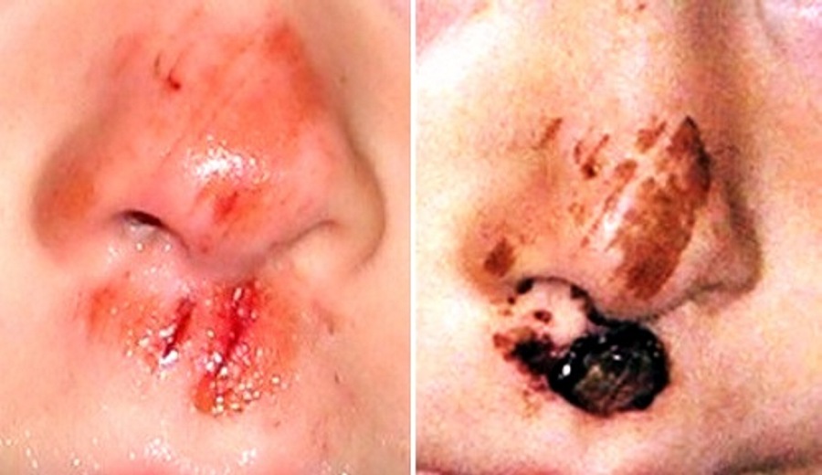 Hemostáza u oděrky s drobnými tržnými rankami. Obličej patří k dobře prokrveným částem těla, takže i drobné rány dramaticky krvácí. Vlevo: Poranění na nose jsou mělká a k zastavení krvácení na většině zasažené plochy stačilo pouze stažení kapilár a reakce destiček. Uniklá krev byla setřena při stavění krvácení a rána je pokrytá pouze prosáklou plazmou bez červených krvinek. Hlubší tržné ranky jsou zachyceny ve stádiu stabilizované fibrinové sítě, ve které jsou zachyceny červené krvinky. U pravé ranky je viditelné, že stabilizace fibrinové sítě je provázena smrštěním fibrinové zátky. Při tomto smrštění bylo vytlačeno krevní sérum, patrné jako jantarově zbarvená kapička pod rankou. Vpravo: Hojení po šesti dnech. Oděrky na nose jsou překryty strupy vzniklými koagulací prosáklé plazmy s malým množstvím zachycených červených krvinek. Na dolním rtu prvotní fibrinová zátka nestačila k fixaci tržných zranění a ranky začaly znovu krvácet. Strup z většího koagula ponechaného po druhotném krvácení nejen překryl defekty, ale i díky působícímu mechanickému napětí (vzniklému při stabilizaci fibrinové sítě) zabránil opětovnému krvácení po větších pohybech rtu při jídle a mluvení.