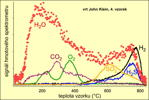 Spektrum těkavých látek při zahřívání čtvrtého vzorku odebraného z vrtu John Klein. Výsledky prokazují přítomnost chloristanů (perchlorátů), uhličitanů, síranů a sirníků. Odpar vodní páry prozrazuje jílové horniny. Zdroj: NASA.