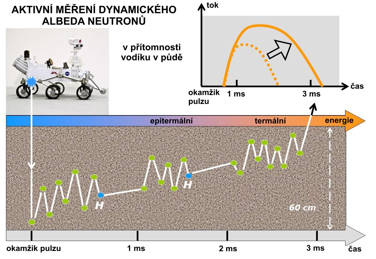 Záznam činnosti aparatury DAN (Dynamic Albedo of Neutrons), která je prvotním testem pro hledání vody v podpovrchových horninách. Odezva na neutronový tok vysílaný aparaturou v podobě detekce vodíku je očekávaným důkazem přítomnosti snad i molekulární vody. Zdroj: NASA.