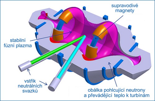 První fúzní experimenty se dělaly na plazových vláknech (tzv. pinčíchPinč – pinč neboli plazmové (proudové vlákno) patří snad k nejběžnějším útvarům v plazmatu. V nejjednodušší konfiguraci (tzv. z-pinč) teče proud v ose pinče a kolem pinče vytváří azimutální magnetické pole, které působí Lorentzovou silou na plazmové vlákno a snaží se ho smrštit (pinch = stlačit). Stlačením se plazma adiabaticky zahřívá, magnetické pole koná práci. Po čase se ustaví rovnováha mezi gradientem tlaku plazmatu, který se snaží plyn rozepnout a Lorentzovou silou, která pinč komprimuje. Tato rovnováha je nestabilní a pinč tohoto typu se rychle rozpadá. Stabilnější jsou helikální pinče, které mají nenulovou jak azimutální tak osovou složku pole.), která jsou stlačována vlastním magnetickým polem. Myšlenka udržení plazmatuPlazma – kvazineutrální soubor nabitých a neutrálních částic, který vykazuje kolektivní chování. Lidsky to znamená, že se v dané látce nachází elektricky nabité částice. Kladné a záporné náboje se navzájem kompenzují, takže celek je elektricky neutrální. Částice jsou schopné reagovat na elektrická a magnetická pole jako celek. Plazma vzniká odtržením elektronů z elektrického obalu atomárního plynu nebo ionizací molekul. S plazmatem se můžeme setkat v elektrických výbojích (blesky, jiskry, zářivky), v polárních zářích, ve hvězdách, ve slunečním větru a v mlhovinách. Pro plazma jsou typické silně nelineární jevy a nestability. Přes 99 % atomární látky ve vesmíru je v plazmatickém skupenství. v magnetické pasti se později rozvinula a vedla k tokamakůmTokamak – TOroidnaja KAmera s MAgnitnymi Katuškami, jedná se o obří transformátor, jehož sekundární obvod je tvořen velmi horkým ionizovaným plynem – plazmatem. Plazma je drženo v pracovním prostoru toroidálního tvaru. Zařízení je používáno k udržení plazmatu pro termojadernou fúzi. Princip tokamaku navrhli po druhé světové válce Igor Tamm a Andrej Sacharov v bývalém Sovětském svazu. Největší tokamak (ITER) je budován v jižní Francii v blízkosti hradu Cadarache, průměr komory bude mít 6 metrů, se spuštěním se počítá po roce 2025. v Sovětském svazu a stelarátorům ve Spojených státech. V tokamaku je plazma samotné sekundárním závitem obřího transformátoru a protékající elektrický proud nejenom že plazma zahřívá, ale vytváří i část pole nutného k jeho udržení. Plazma zaujímá prostor toroidu, tato geometrie je výhodná, protože plazmový sloupec je stočený a nemá žádný konec, kterým by plazma unikalo. Protipólem tokamaků jsou stelarátory, opět je v nich plazma drženo v toroidální geometrii důmyslnou kombinací magnetických polí, ta ale nevznikají průtokem proudu plazmatem. Název stelarátor má připomínat slovo stella (hvězda), a symbolizovat tak uskutečnění hvězdné reakce na Zemi. Existuje ale i řada dalších systémů, k nejvýznamnějším patří inerciální fúze, kde se ozařuje malá peleta (terčík s palivem) z mnoha stran výkonným laserem, čímž vznikne na krátkou dobu fúzní plazma, které je drženo pohromadě pouhou setrvačností. Zkoumají se i různá hybridní řešení, tj. kombinace několika principů, včetně kombinace fúze i štěpení. Fúzní výzkum je během na dlouhou trať: malé, ale vytrvalé pokroky vedou ke vzdálenému cíli – zdroji energie budoucnosti.