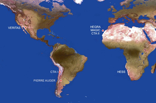 Polohy nejvýznamnějších observatoří pozemské gama astronomie.