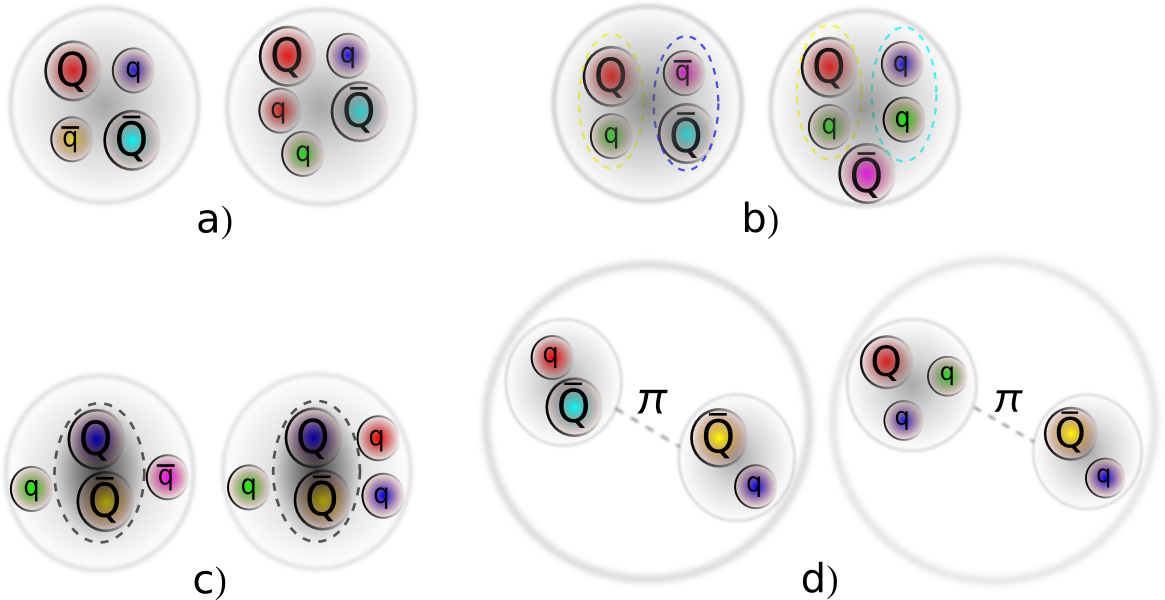 Obr. 6.: Několik hypotéz pro konfiguraci kvarkových stavů uvnitř pozorovaných tetrakvarků a pentakvarků. Q označuje těžký kvark (c,b), q lehký kvark (u,d,s). a) Kompaktní mnohokvarkový stav vázaný silnou interakcí obdobným způsobem jako v klasických hadronech. b) Vázaný stav dikvarků, dikvarky interagují mezi sebou prostřednictvím gluonů. c) Hadro-charmonium je hadronický objekt který obsahuje v jádře vázaný stav cc a haló lehkých kvarků nebo mezonů. Uprostřed oblaku lehkých kvarků je kompaktní bezbarvé charmonium. Interakce mezi jádrem a obálkou probíhá pomocí QCD analogie van der Waalsových sil. d) Molekulární stavy, kde pár těžkých mezonů (nebo mezon a baryon) interagují podobně jako nukleony prostřednictvím výměny virtuálních lehkých mezonů.