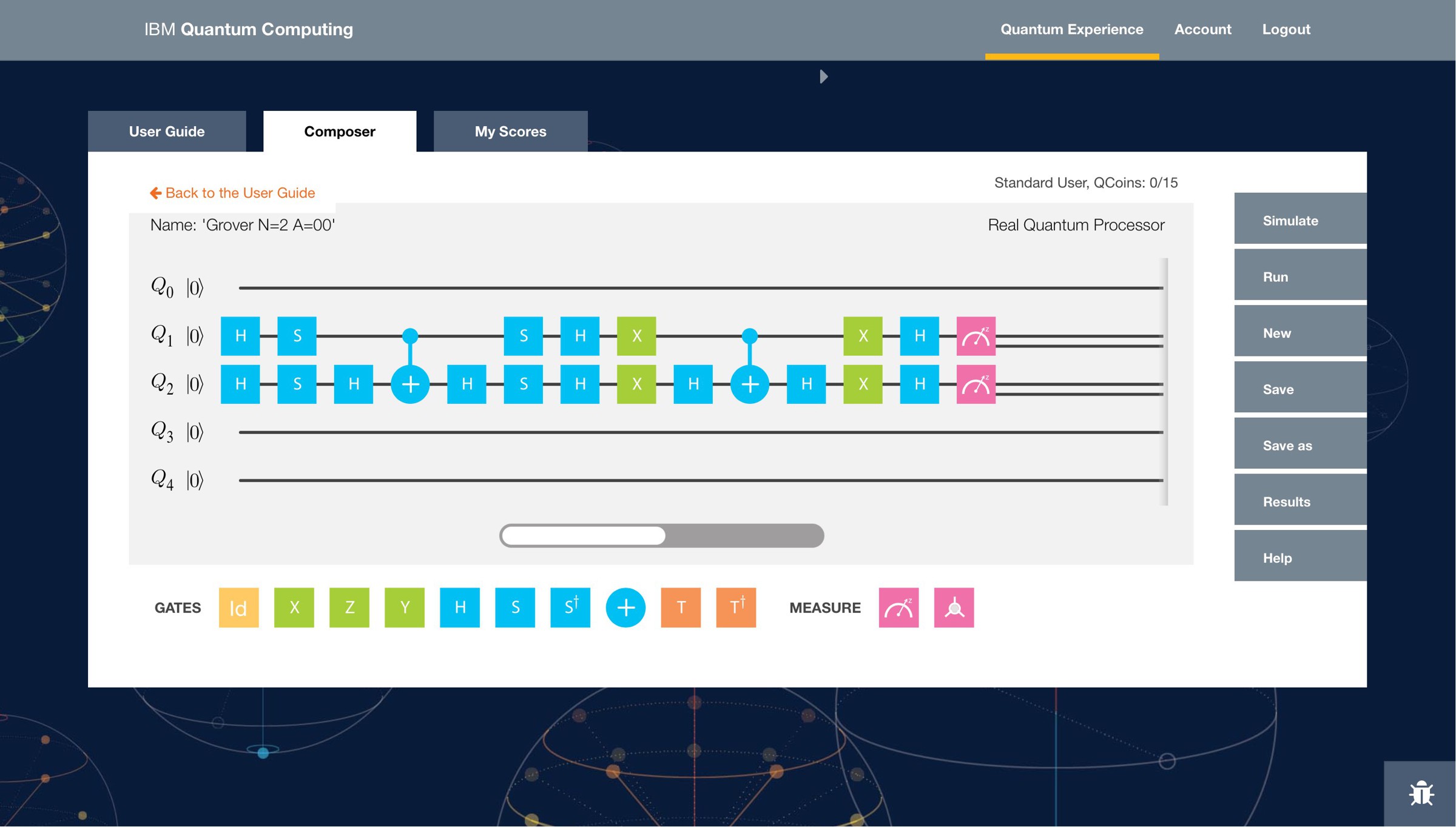Uživatelské rozhraní pětiqubitové verze Quantum Experience. V dolním řádku je