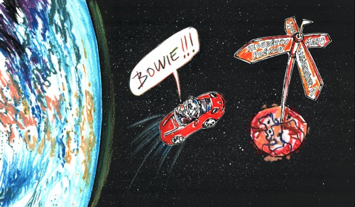I když šlo jen o demonstrační let, kterému Elon Musk odhadoval padesátiprocentní šanci na úspěch, přesto se povedl a otevře další okno a možnosti pro zkoumání vesmíru. Kresba: Ivan Havlíček. David Bowie: Starman.