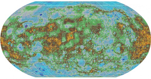 Hustota povrchu Merkuru příliš nekoresponduje s relativním převýšením. Jednotlivé barvy odpovídají různým horninám a nerostům Zdroj: NASA/Johns Hopkins University APL/Carnegie Institution of Washington.