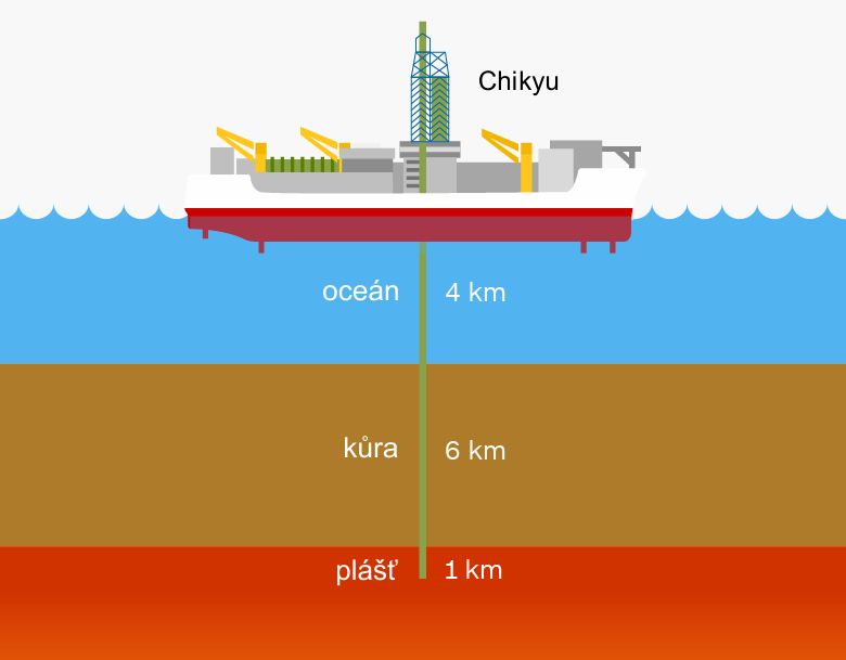 Klíčovou roli v mezinárodním úsilí posledních let hraje japonská vědecká agentura JAMSTECJAMSTEC – japonská agentura určená k vědeckému výzkumu vztahu oceánů a Země (Japan's Agency for Marine-Earth Science and Technology's). Funguje jako výzkumný ústav. Založena byla v roce 1971 se sídlem v japonském městě Jokosuka. Dnes má vědecká střediska v dalších pěti městech., která nechala za účelem provrtání kůry Země postavit speciální obří loď ChikyuChikyu – vědecká loď s vrtnou plošinou, kterou zakoupila japonská agentura JAMSTEC v roce 2005. Loď byla pro tuto vědeckou agenturu vyrobena v roce 2001. Délka lodi je 210 metrů, výtlak 57 000 tun. Vrtná věž ční 121 metrů nad mořskou hladinu. Loď je schopna dosáhnout rychlosti 22 kilometrů za hodinu. Česká transkripce názvu lodi je Čikjú. V anglických materiálech se někdy objevuje přepis Chikyū, na samotné lodi je napsáno Chikyu. s vrtnou soupravou. Loď postavili společnosti Mitsubishi a Mitsui Engineering & Shipbuilding v roce 2001. Na vodu byla spuštěna v roce 2002 a od roku 2005 ji vlastní CDEX (Centre for Deep Earth Research), což je oddělení agentury JAMSTEC. Loď je hlavní součástí mezinárodního programu IODP, který odstartoval v roce 2013. Vrty mořského dna se provádějí v zajímavých seismických oblastech a pro provrtání zemské kůry byly vytipovány tři oblasti v Tichém oceánu: Havaj, Kostarika a Mexiko. Na Havaji už byly provedeny první předběžné vrty.