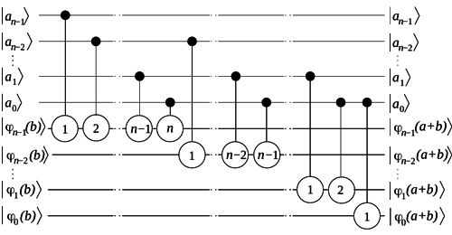Registr a zůstane nezměněn, hodnota druhého registru odpovídá kvantové Fourierově transformaci (a + b) mod 2n.
