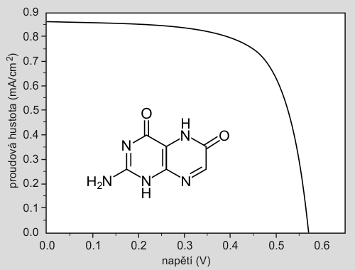 Po fázi reverzního inženýrství již bylo jednoduché vyrobit tzv. DSSC-Dye-Sensitized Solar Cell. Metodou elektroforetické depozice (EPD – ElectroPhoretic Deposition) byly naneseny čtyři 12μm filmy TiO2 na skleněnou destičku pokrytou cínem dopovaným fluorem. Elektrody byly následně po dobu 24 hodin marinovány v lihovém roztoku xanthopterinu. Jako protielektroda byla použita skleněná deska potažená platinou. K osvětlení článku o ploše 0,64 cm2 byla použita xenonováXenon – plynný chemický prvek, patřící mezi vzácné plyny. Je bezbarvý, bez chuti a zápachu, nereaktivní. Chemické sloučeniny tvoří pouze vzácně s fluorem, chlorem a kyslíkem. Xenon objevil William Ramsay v roce 1898. Využívá se v xenonových výbojkách. lampa 250 W kalibrovaná na 100 mWcm−2. Voltampérová charakteristika (viz graf) vykazuje pro proudové hustoty mezi 0,8÷0,9 mAcm−2 plochou závislost až 0,35 V. Pak začne strmě klesat.