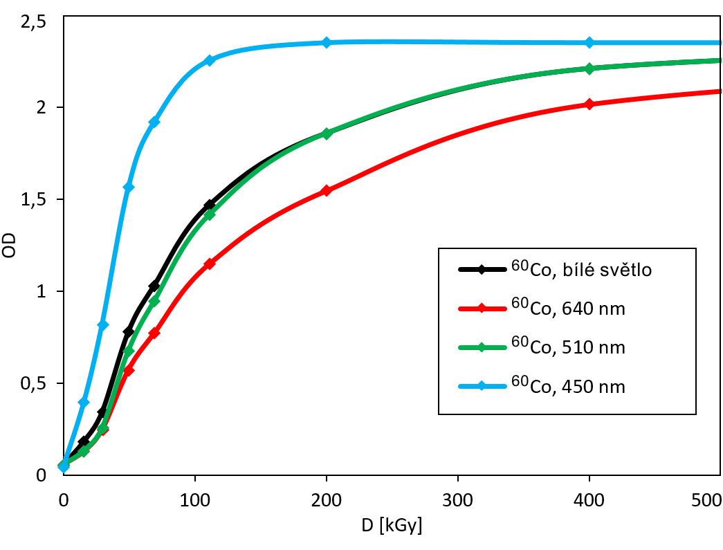 V oblasti krátké vlnové délky 450 nm dochází při dávceAbsorbovaná dávka – D, energie ionizujícího záření pohlcená při průchodu látkou jednotkovým množstvím hmoty (dE/dm). Jednotkou je jeden gray (Gy = J/kg). U člověka dochází k prvním projevům nemoci z ozáření po celotělové aplikaci dávky 1 Gy, za smrtelnou je považována dávka cca 5 Gy. Dávky nad 100 Gy mohou člověka usmrtit i na místě. nad 50 kGy k pozvolné saturaci a při dávkách nad 100 kGy (ODOptická denzita – OD, dekadický logaritmus podílu intenzity dopadajícího a prošlého světelného záření. ≈ 2,3) i k saturaci úplné. Na větších vlnových délkách se závislost OD(D) (optické denzity na dávce) od dávky 100 kGy jen pozvolna zmenšuje, k úplné saturaci dochází až mnohem později – při dávce okolo 500 kGy. Nicméně, již od 200 kGy nejistota stanovení dávky z OD rychle narůstá (Obr. 6).