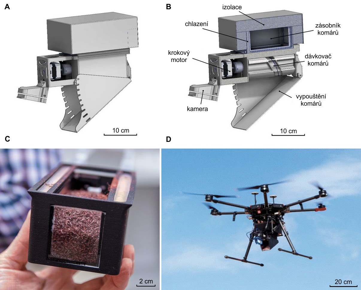 Pro vypuštění nákladu sterilních samečků komárů bude potřeba použít leteckou techniku, zejména pokud bude nutné pokrýt velké oblasti. Takové uvolňovací systémy byly vyvinuty pro programy SITSIT – Sterile Insect Technique, vypouštění sterilních komárů či jiných přenašečů (sterilizovaných například ozářením) do volné přírody. Jde o šetrnou alternativu k hubení hmyzu insekticidy. bojující proti ovocným muškám (octomilkám), můrám a mouchám tse-tse. Existuje však jen málo systémů pro účinné vypouštění komárů a hmyzu obecně pomocí dronů. Proto byl vyvinut plně automatický uvolňovací systém pro vypouštění dospělých sterilních komářích samečků rodu Aedes, které lze vypustit pomocí malých bezpilotních letadel, obecně známých jako drony. Uvolnění sterilních komárů pomocí dronů by mohlo dvacetinásobně snížit náklady na kontrolu jimi přenášených nemocí.