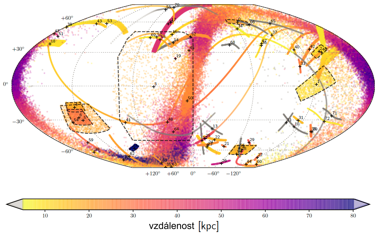 Zobrazení dosud známých hvězdných proudů v celooblohové projekci. Legenda: 0: VOD/VSS; 1: Monoceros; 2: EBS; 3: Her - Aq; 4: PAndAS; 5: Tri - And; 6: Tri - And2; 7: PiscesOv; 8: EriPhe; 9: Phoenix; 10: WG1; 11: WG2; 12: WG3; 13: WG4; 14: Acheron; 15: Cocytosa; 16: Lethe; 17: Styx; 18: ACS; 19: Pal15; 20: Eridanus; 21: TucanaIII; 22: Indus; 23: Jhelum; 24: Ravi; 25: Chenab; 26: Elqui; 27: Aliqa Uma; 28: Turbio; 29: Willka Yaku; 30: Turranburra; 31: Wambelong; 32: Palca; 33: Jet; 34: Gaia-1; 35: Gaia-2; 36: Gaia-3; 37: Gaia-4; 38: Gaia-5; 39: PS1-A; 40: PS1-B; 41: PS1-C; 42: PS1-D; 43: PS1-E; 44: ATLAS; 45: Ophiucus; 46: Sangarius; 47: Scamander; 48: Corvus; 50: Sgr-L10; 51: Orphan; 52: Pal5; 53: GD-1; 54: Tri/Pis; 55: NGC5466; 56: Alpheus; 57: Hermus; 58: Hyllus; 59: Cetus; 60: Kwando; 61: Molonglo; 62: Murrumbidgee; 63: Orinoco; 64: Phlegethon; 65: Slidr; 66: Sylgr; 67: Ylgr; 68: Fimbulthul; 69: Svol; 70: Fjorm; 71: Gjoll; 72: Leiptr. Zdroj: Amina Helmi, University of Groningen.