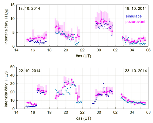 Přímá měření aurorálních emisí byla doplněna numerickými simulacemi disociace vodních molekul a následné atomární emise excitovaných atomů. Jako vstupní data numerické simulace posloužila energetická spektra přítomných elektronů slunečního větru, která měřil elektronový spektrometr RPC. Data z numerických simulací jsou ve velmi dobrém souladu s měřenými emisemi, což poukazuje na to, že mechanizmus vzniku polárních září je dobře chápán. Ověřování probíhalo na vybraných datech ze dvou dvoudenních úseků z října 2014. Výsledky simulací i pozorování naleznete v následujícím obrázku.