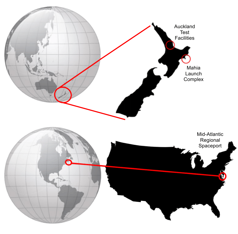 Na obrázku nahoře je zachycena poloha komerčního kosmodromu Rocket Lab Launch Complex 1 nacházejícího na poloostrově Mahia na Novém Zélandu a na obrázku dole poloha ostrova Wallops v americkém státě Virginia, kde se nalézá Mid-Atlantic Regional Spaceport. Zdroj: Rocket Lab.