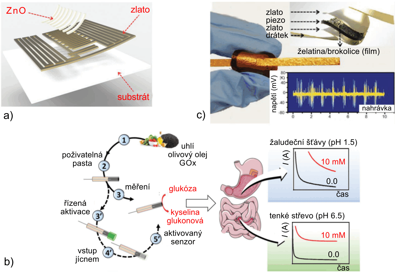 Obr. 5: a) Konstrukce funkčního zařízení na měření pH na bázi změny rezonanční frekvence RC obvodu. b) Princip fungování poživatelného pH detektoru založeného na aktivním uhlí a olivovém oleji určeného k detekci množství cukru v žaludku a ve střevech. c) Konstrukce a zvukový záznam poživatelného mikrofonu založeného na piezoelektrickém jevu v brokolicovo-želatinové vrstvě. Zdroj: [4, 5].