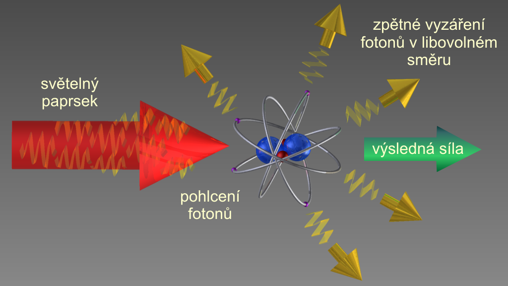 Princip laserového ochlazování. Se slabě podladěným laserovým paprskem interagují pouze atomy pohybující se směrem ke zdroji světla. Po následném vyzáření fotonu náhodným směrem se atom pohybuje pomaleji, než před interakcí.