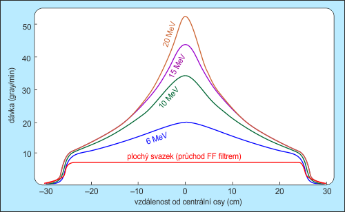 Radioterapie – metoda léčby využívající destruktivních účinků ionizujícího záření na buňky živých tkání. Teleterapie – část radioterapie, při níž se zdroj záření nalézá vně ozařované tkáně a v definované vzdálenosti od povrchu těla pacienta. Brachyterapie – část radioterapie, při níž je zdroj záření v těsném kontaktu s ozařovanou tkání, nebo se zavádí přímo do nitra ozařované tkáně. Ionizující záření – jakékoli radiační pole, jehož kvanta mají dostatečnou energii, aby ionizovaly atomy a molekuly. V biomedicíně musí proniknout do těla a ionizovat biomolekuly. Nepřímo ionizující záření – ionizující záření, které je vyvoláno proudem elektricky neutrálních částic. Generátory ionizujícího záření – skupina zdrojů ionizujícího záření, v nichž jsou nabité částice urychlovány elektrickým polem. K radioterapeutickým účelům se pak využívá buď přímo svazku těchto nabitých částic, nebo sekundárních částic vznikajících při interakčních procesech na vhodných terčících. Filtrace svazku – rentgenové záření, vznikající dopadem urychlených elektronů na vhodný terčík, je tvořeno převážně brzdným zářením se spojitým energetickým spektrem. Vložením filtru z vhodného materiálu (Al, Cu, …) do svazku dojde k potlačení (pohlcení) nízkoenergetických (měkkých) složek brzdného záření, čímž se celé spektrum posune k vyšším energiím (vytvrdí se). |