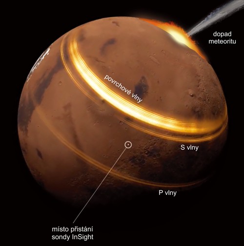 Zemětřesné vlny dělíme na povrchové (LovehoLoveho vlny – seismické vlny, které se šíří v kůře planety po jejím povrchu. Jedná se o příčné vlnění. Jde o typické střižné vlny, které byly pojmenováno podle anglického matematika Augusta Edwarda Hougha Loveho. a RayleighovyRayleighovy vlny – seismické vlny, které se šíří v kůře planety po jejím povrchu. Podobají se vlnění na vodě. Jedná se o složeninu příčného a podélného vlnění. Body vykonávají krouživé pohyby. Vlny byly pojmenovány podle anglického matematika a fyzika Johna Williama Strutta, třetího barona Rayleigho. ) a podpovrchové (P vlnyP vlny – primární seismické vlny, které se šíří vlastním tělesem planety. Jedná se o podélné vlny zhuštění a zředění v pevném nebo kapalném prostředí, někdy tento typ vln označujeme jako kompresní vlny. Písmeno P pochází z anglického slova Primary. a S vlnyS vlny – sekundární seismické vlny, které se šíří vlastním tělesem planety. Jedná se o příčné vlny v pevném prostředí. Kapalným prostředím se nešíří. Látka v této vlně vybočuje kolmo na směr šíření, a vytváří tak charakteristické zvlnění. Písmeno S pochází z anglického slova Secondary.). Naprostá většina měření detekovala podpovrchové vlny. Ukázalo se, že se šířily z epicentra nacházejícího se 1 200 kilometrů od místa přistání, z oblasti Cerberus Fossae, která je součástí rozsáhlé planiny Elysium PlanitiaElysium Planitia – významná sopečná oblast na povrchu Marsu. Nachází se severně od rovníku, v okolí sopky Elysium Mons. Kromě této sopky je charakteristická velkým množstvím menších sopek.. Všem bylo jasné, že se na Marsu mohou šířit i povrchové vlny, ale dlouho se je nedařilo detekovat. Velkou událostí se proto stal pád meteoritu dne 24. prosince 2021, který způsobil i šíření povrchových vln. Ze snímků sondy Mars Reconnaissance OrbiterMRO – Mars Reconnaissance Orbiter (Průzkumná oběžnice Marsu), sonda NASA, která získává detailní informace o vybraných místech na Marsu, zejména s ohledem na přítomnost vody v minulosti i v současnosti. Sonda startovala v srpnu 2005 a na oběžnou dráhu byla navedena v březnu 2006. Rozlišení je pouhých několik decimetrů. Od ledna 2009 slouží také jako retranslační stanice. se ukázalo, že impaktní kráter vznikl 3 500 kilometrů od místa přistání sondy InSight. Lokalizace místa dopadu byla přesně ve shodě s výpočty ze seismických vln. Šlo o první příležitost analyzovat povrchové horniny nejenom v těsném okolí sondy InSight. Ukázalo se, že mezi místem dopadu a sondou jsou povrchové horniny mimořádně homogenní a hustší, než se dosud předpokládalo.