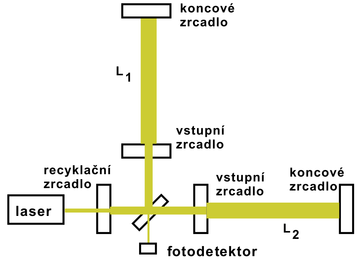 Popis: Princip interferometru LIGO pro hledání gravitačních vln. Autor: Petr Kulhánek/Aldebaran Formát: tif 1513×1102, cdr |