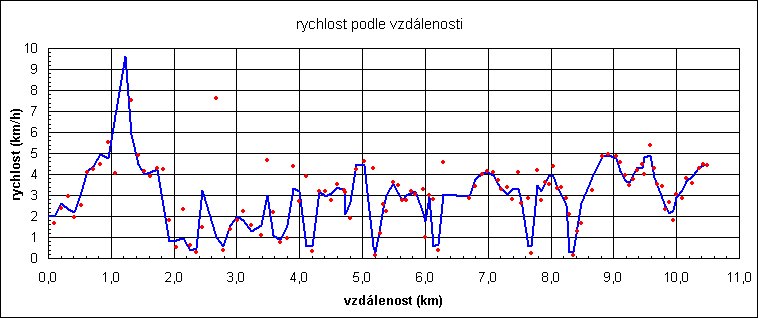 Všechny grafy rychlostí jsem proložil klouzavým průměrem pro dva sousední body ale počítaný z definice rychlosti. Proložení nemá předchozí vady zmíněné v poznámkách a průběhy jsou mnohem realističtěji. Při tomto průměrování jsem si také všiml, že rychlost lanovky vyšla ve třech sousedních bodech shodně, 10,65 km/h.