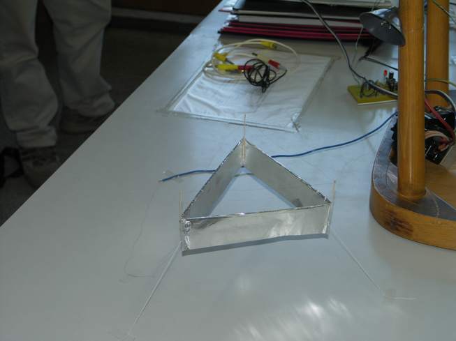 Jedná se o systém elektrod tvořený hliníkovou fólií a drátkem, připojený tenoučkými drátky ke zdroji vysokého napětí (v tomto případě posloužil vysokonapěťový transformátor z televizního přijímače). Po připojení napětí celý systém začne levitovat. Zážitek z experimentu, který není možné pomocí fotografií zprostředkovat, spočívá v tom, že při pozvolném zvyšování napětí se elektrody najednou lehce nadzdvihnou, třeba jen jednou stranou, při dalším zvyšování napětí se vznese celý systém až do napnutí nití, které omezují výšku, do které se systém může vznést.